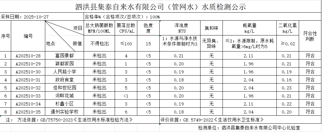 泗洪縣集泰自來水公司2025年10月份水質檢測公示