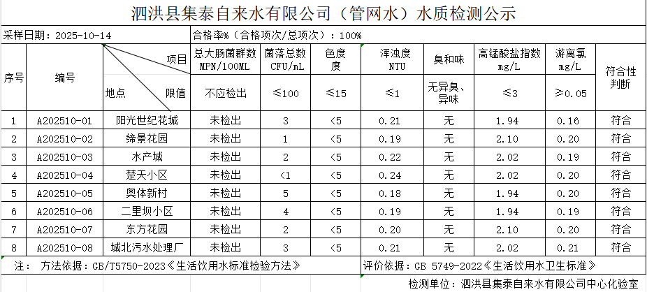 泗洪縣集泰自來水公司2025年10月份水質檢測公示