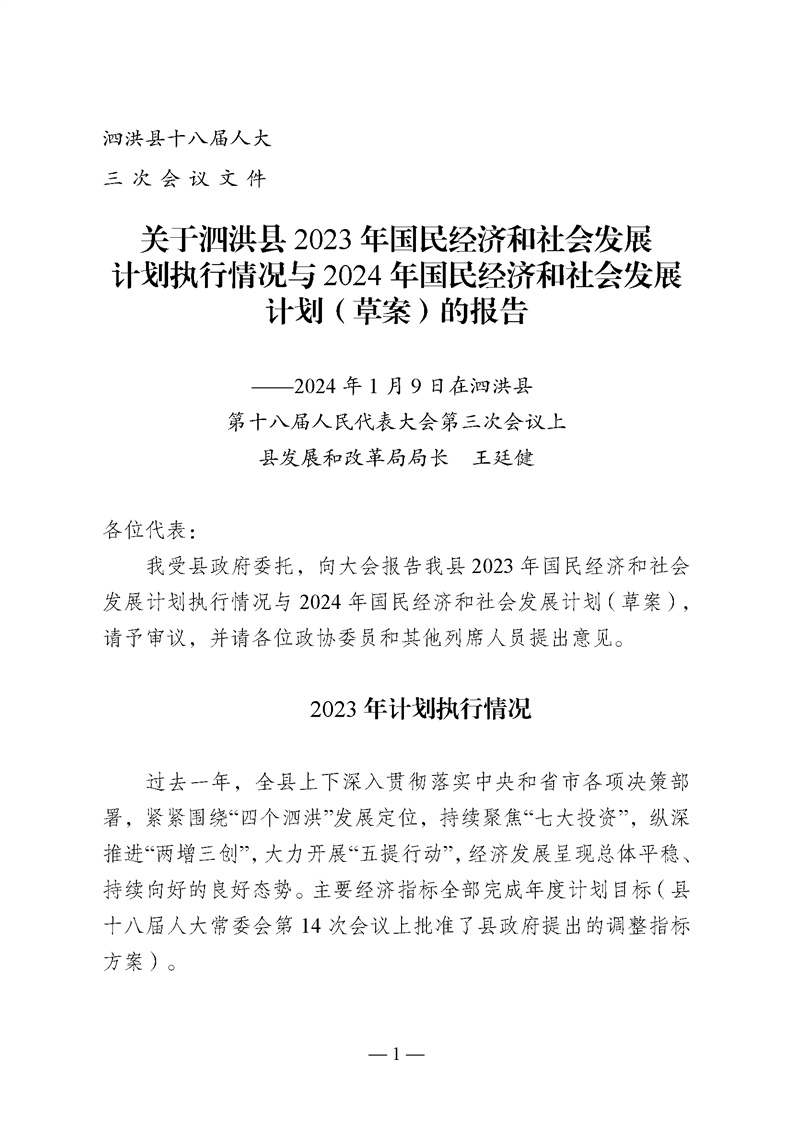 關(guān)于泗洪縣2023年國民經(jīng)濟(jì)和社會(huì)發(fā)展計(jì)劃執(zhí)行情況與2024年國民經(jīng)濟(jì)和社會(huì)發(fā)展計(jì)劃(草案)的報(bào)告