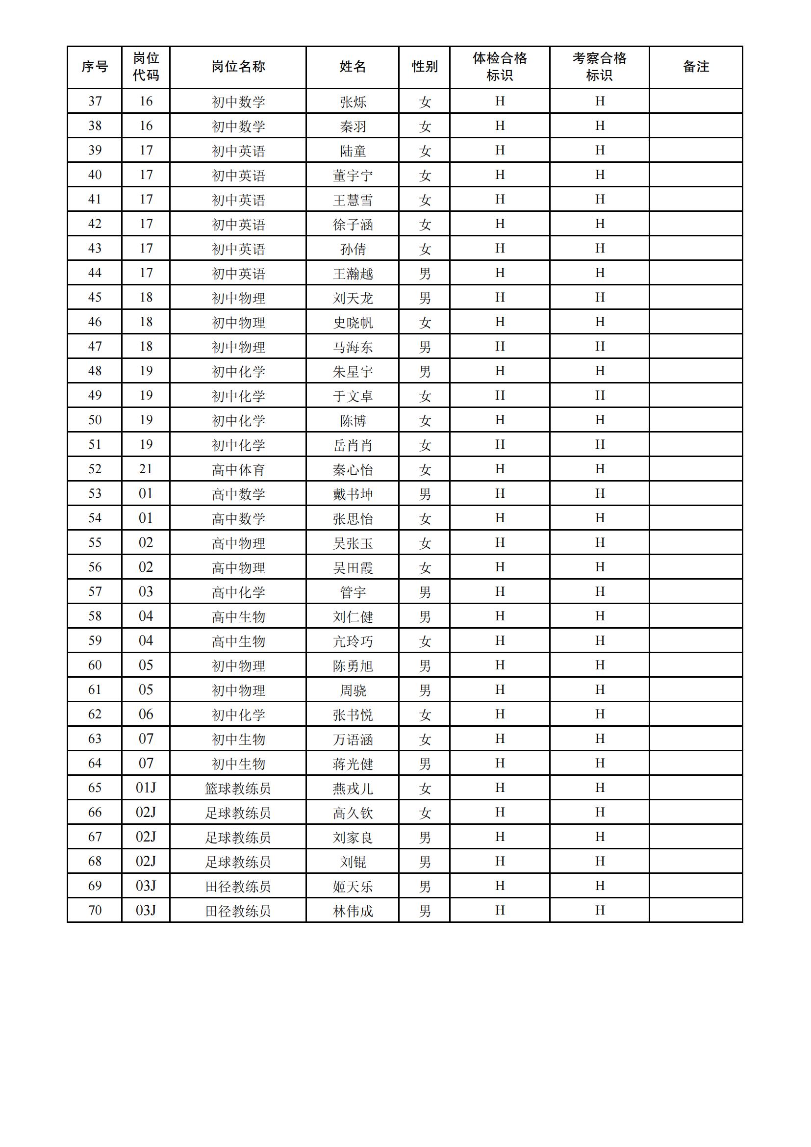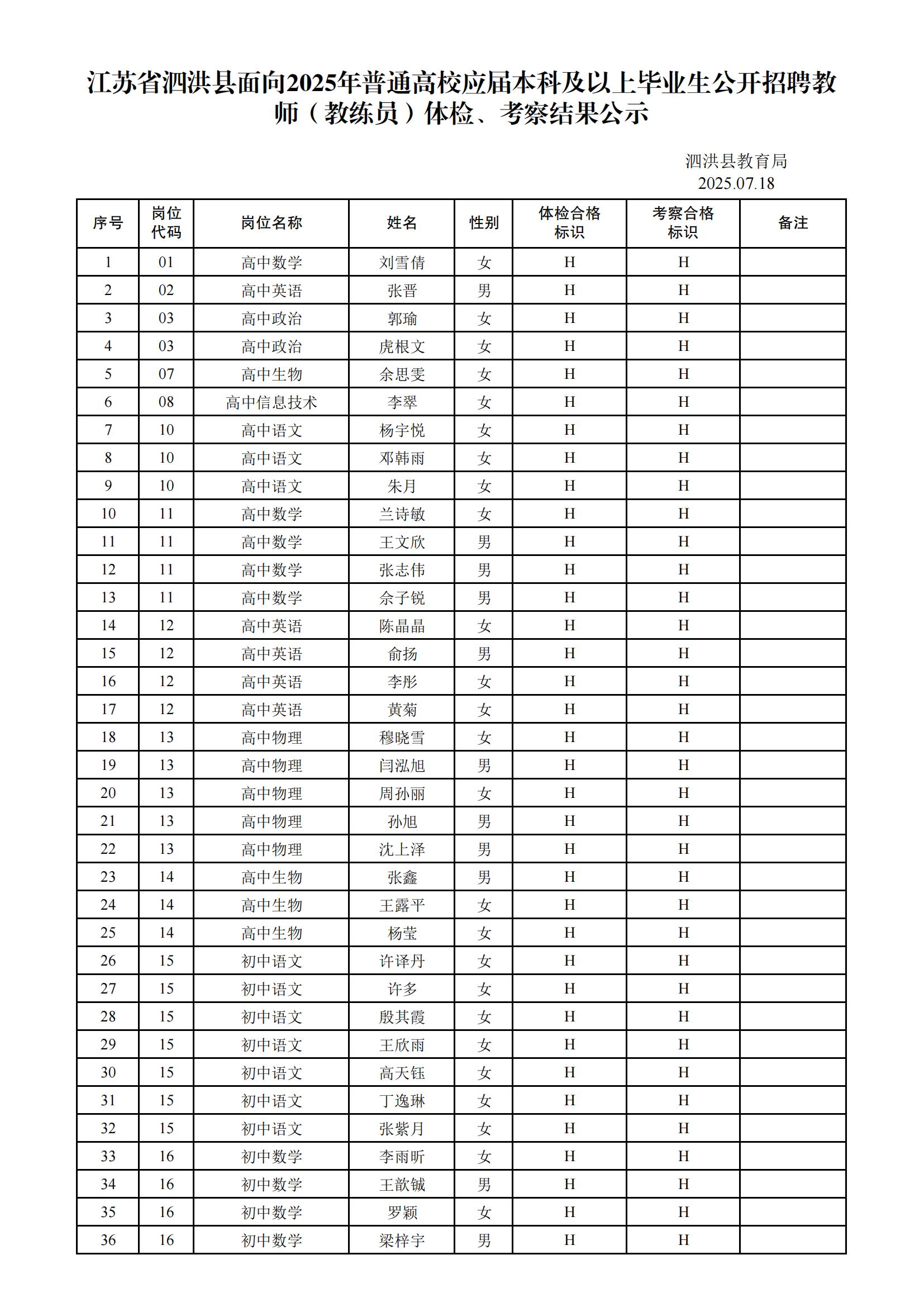 江蘇省泗洪縣面向2025年普通高校應屆本科及以上畢業生公開招聘教師(教練員)體檢、考察結果公示