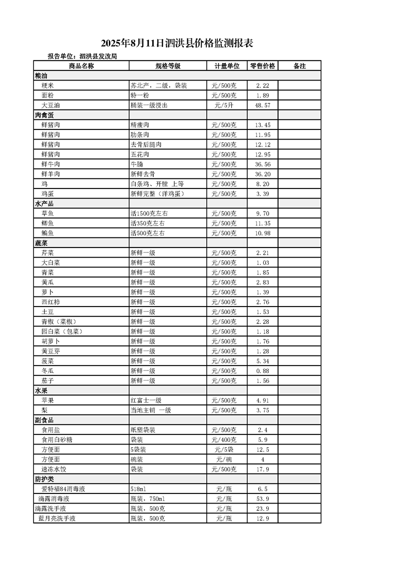 2025年8月11日泗洪縣價格監(jiān)測報表