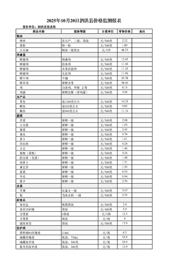 2025年10月20日泗洪縣價(jià)格監(jiān)測(cè)報(bào)表