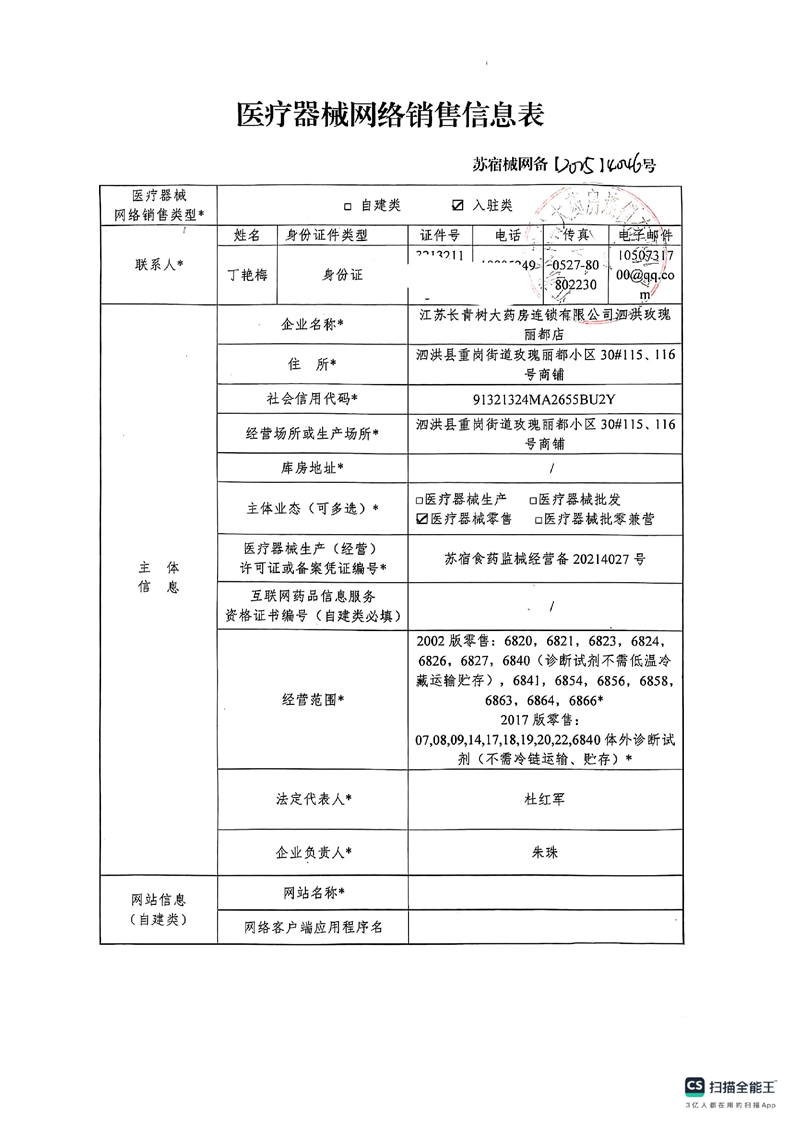 醫(yī)療器械網(wǎng)絡(luò)銷售備案公示(江蘇長青樹大藥房連鎖有限公司泗洪玫瑰麗都店)