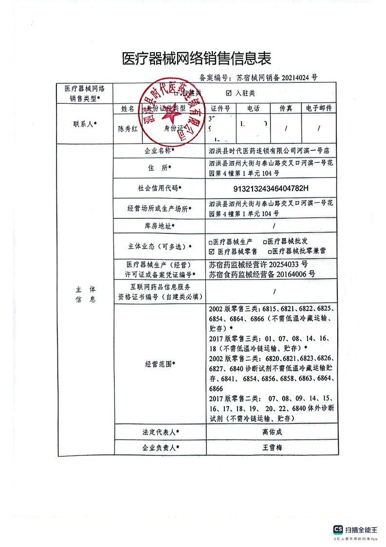 醫療器械網絡銷售備案公示(泗洪縣時代醫藥連鎖有限公司河濱一號店)