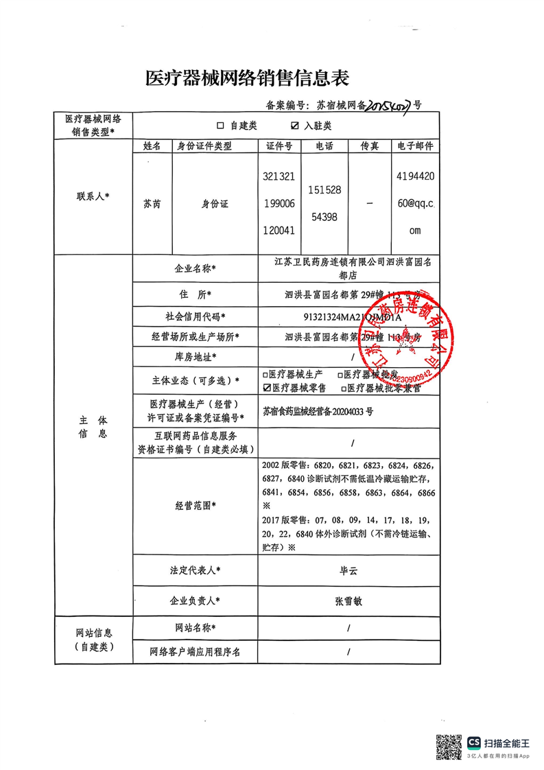 醫(yī)療器械網(wǎng)絡(luò)銷售備案公示(江蘇衛(wèi)民藥房連鎖有限公司泗洪富園名都店)