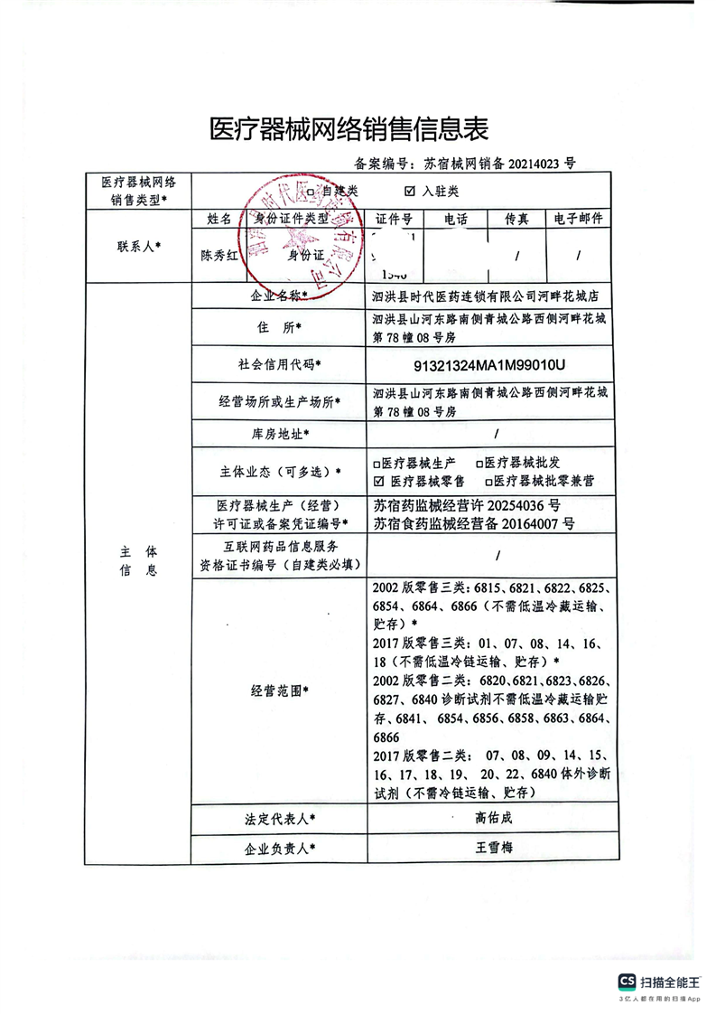 醫(yī)療器械網(wǎng)絡(luò)銷售備案公示(泗洪縣時代醫(yī)藥連鎖有限公司河畔花城店)