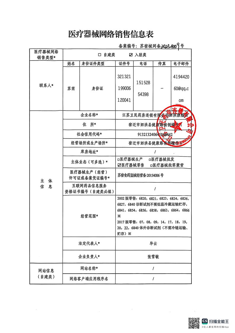 醫療器械網絡銷售備案公示(江蘇衛民藥房連鎖有限公司泗洪旗艦店)
