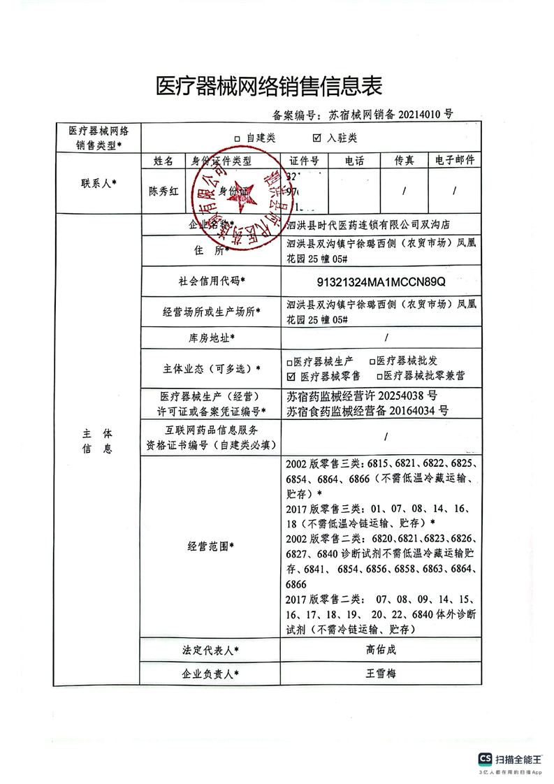 醫療器械網絡銷售備案公示(泗洪縣時代醫藥連鎖有限公司雙溝店)