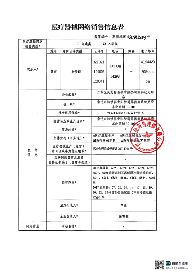 醫(yī)療器械網(wǎng)絡銷售備案公示(江蘇衛(wèi)民藥房連鎖有限公司泗洪狀元府店)