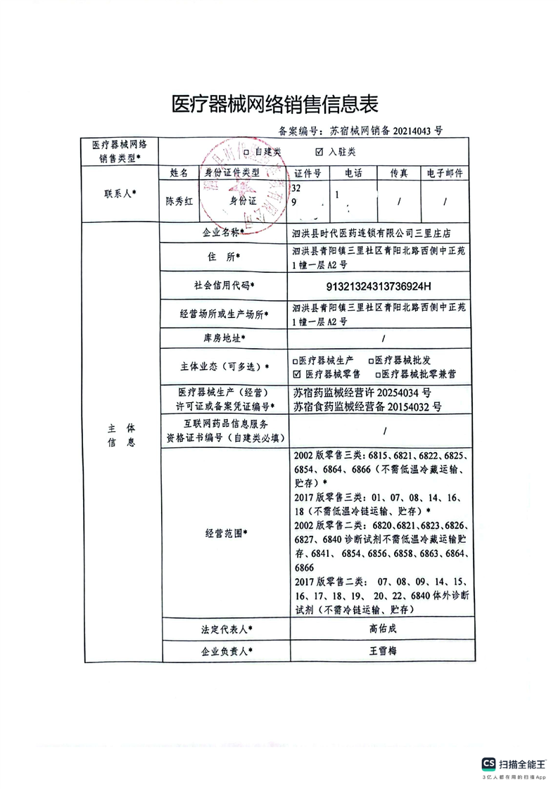醫療器械網絡銷售備案公示(泗洪縣時代醫藥連鎖有限公司三里莊店)