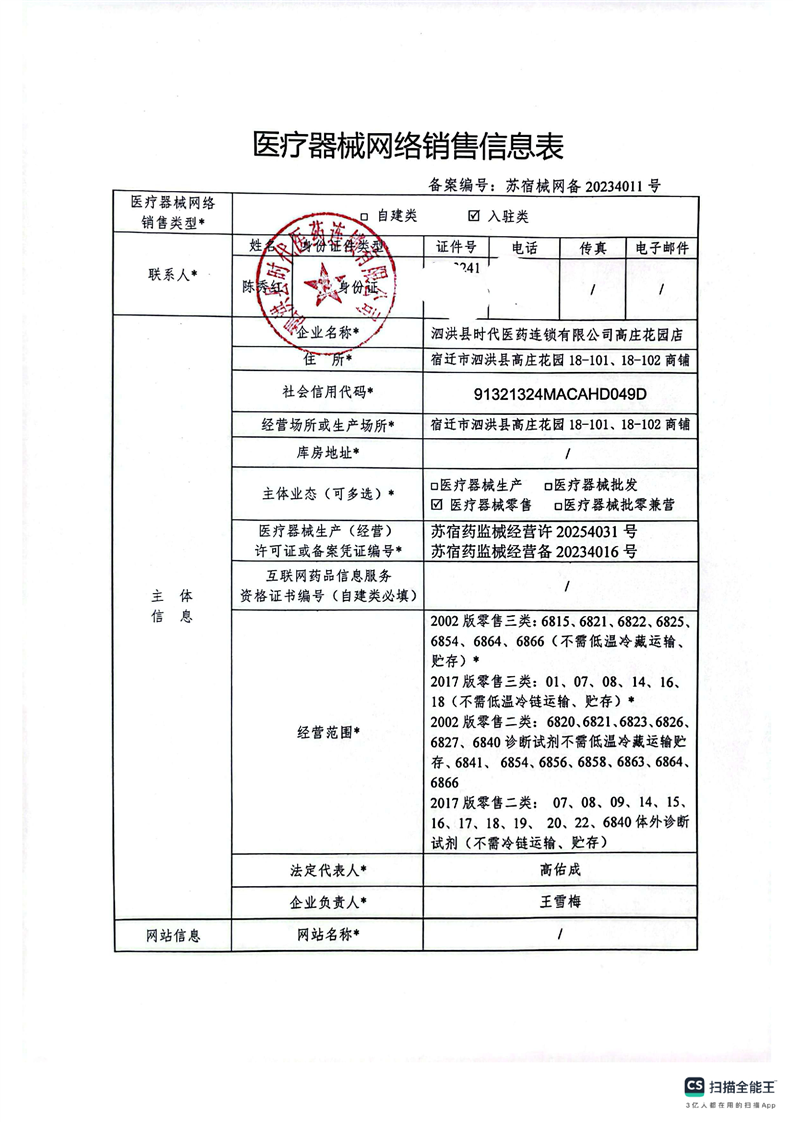 醫(yī)療器械網(wǎng)絡(luò)銷售備案公示(泗洪縣時代醫(yī)藥連鎖有限公司高莊花園店)