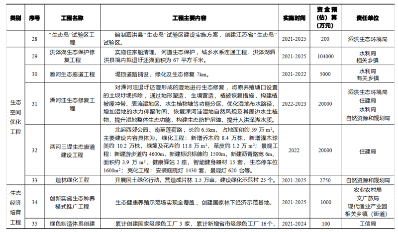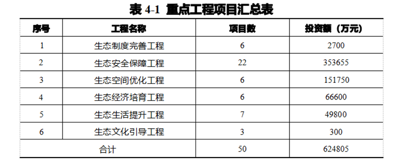 基于泗洪縣生態文明建設規劃內容,統籌安排生態制度完善工程、 生態安全保障工程、生態空間優化工程、生態經濟培育工程、生態生 活提升工程、生態文化引導工程 6 大體系、50 項重點工程 ,各類項目具體數量和投資額見表 4- 1 ,工程項目明細見表 4-2。