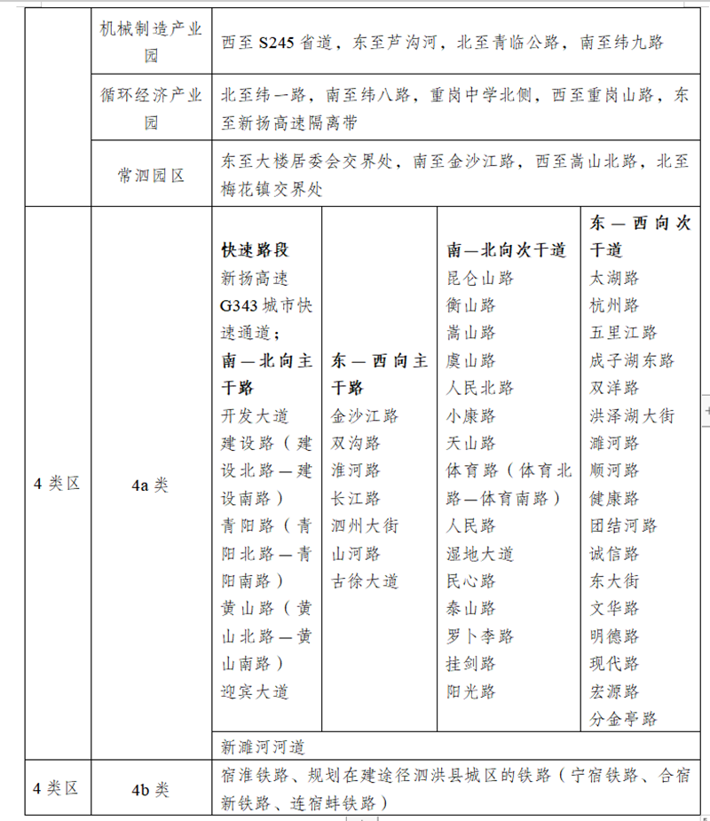 4a類標(biāo)準(zhǔn)適用于高速公路、一級公路、二級公路、城市快速路、城市主干路、城市次干路、城市軌道交通(地面段)、內(nèi)河航道兩側(cè)區(qū)域;4b類標(biāo)準(zhǔn)適用于鐵路干線兩側(cè)區(qū)域。