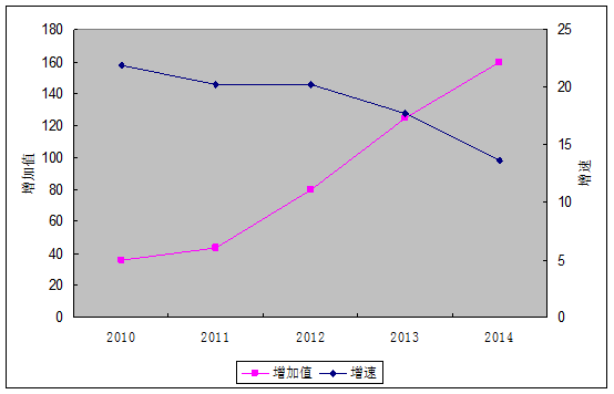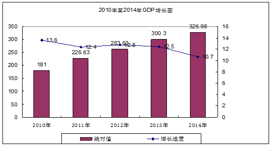 圖2:2010年-2014年全縣地區生產總值及增幅圖