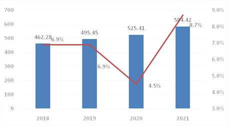 圖1:2016-2021年泗洪縣地區(qū)生產總值情況圖