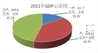 經濟總量顯著提升。2021年全縣地區(qū)生產總值584.42億元,同比增長8.7%,兩年平均增長6.6%。其中,第一產業(yè)增加值88.7億元,同比增長1.8%,兩年平均增長2.1%;第二產業(yè)增加值226.12億元,同比增長9.4%,兩年平均增長6.9%;第三產業(yè)增加值269.6億元,同比增長10.6%,兩年平均增長7.9%。