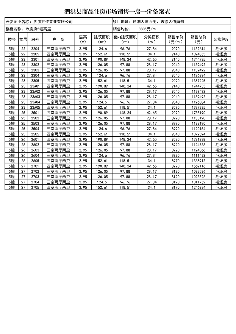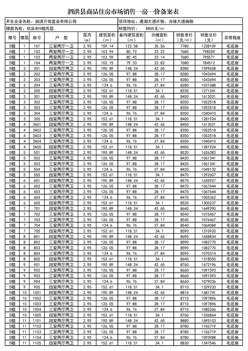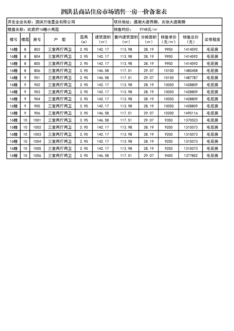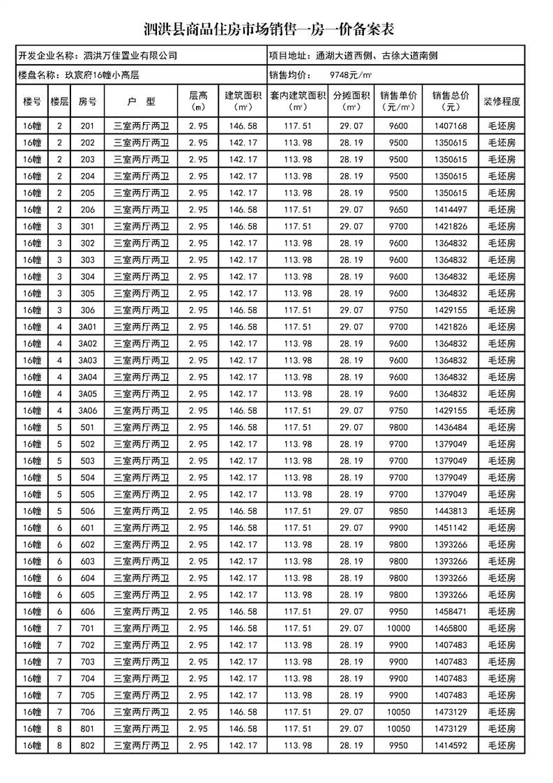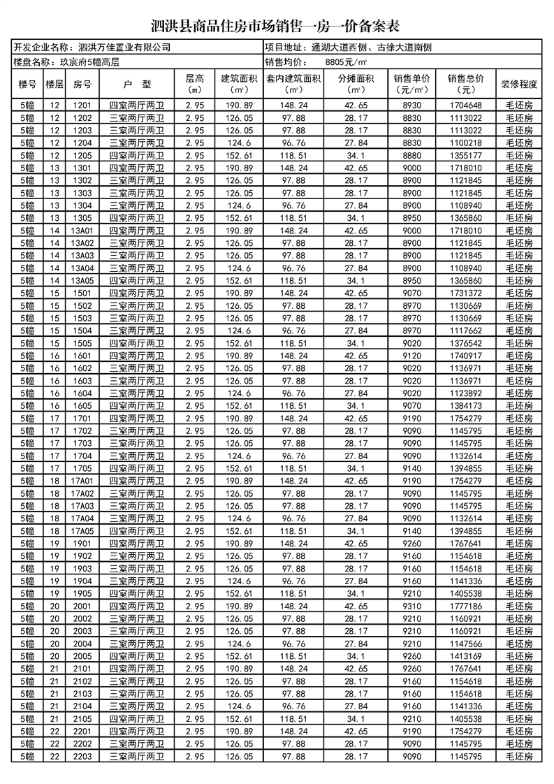 玖宸府5#、16#泗洪縣商品住房市場(chǎng)銷(xiāo)售一房一價(jià)備案表